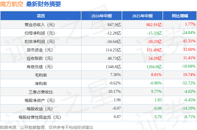 据证券之星公开数据整理,近期南方航空(600029)发布2025年中报。根据财报显示,南方航空增收不增利。截至本报告期末,公司营业总收入862.91亿元,同比上升1.77%,归母净利润-15.33亿元,同比下降24.84%。按单季度数据看,第二季度营业总收入428.84亿元,同比上升6.71%,第二季度归母净利润-7.86亿元,同比上升60.38%。