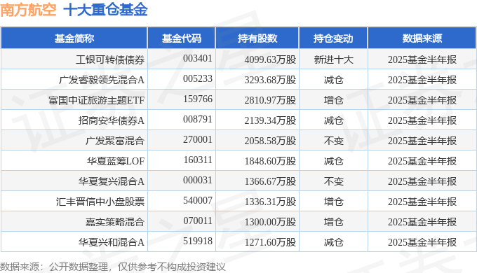 持有南方航空最多的基金为工银可转债债券,目前规模为47.49亿元,最新净值1.7475(8月29日),较上一交易日下跌0.34%,近一年上涨19.43%。该基金现任基金经理为黄诗原。