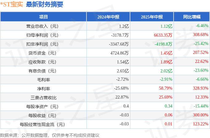 据证券之星公开数据整理,近期*ST宝实(000595)发布2025年中报。截至本报告期末,公司营业总收入1.12亿元,同比下降6.46%,归母净利润6633.35万元,同比上升308.68%。按单季度数据看,第二季度营业总收入7464.71万元,同比上升19.16%,第二季度归母净利润9054.36万元,同比上升701.84%。本报告期*ST宝实公司应收账款体量较大,当期应收账款占最新年报营业总收入比达79.65%。