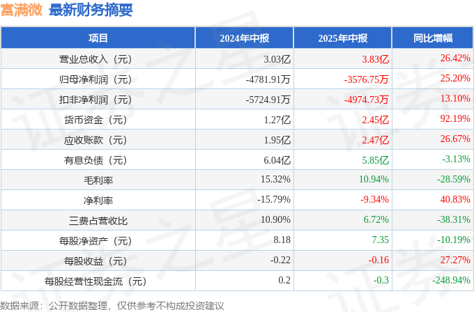 据证券之星公开数据整理,近期富满微(300671)发布2025年中报。根据财报显示,富满微营收上升亏损收窄。截至本报告期末,公司营业总收入3.83亿元,同比上升26.42%,归母净利润-3576.75万元,同比上升25.2%。按单季度数据看,第二季度营业总收入2.14亿元,同比上升35.91%,第二季度归母净利润-1071.47万元,同比上升45.36%。