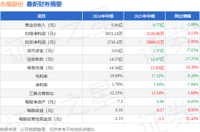 据证券之星公开数据整理,近期永福股份(300712)发布2025年中报。截至本报告期末,公司营业总收入9.77亿元,同比下降1.88%,归母净利润3126.06万元,同比上升3.13%。按单季度数据看,第二季度营业总收入5.52亿元,同比下降1.92%,第二季度归母净利润1214.8万元,同比上升0.62%。本报告期永福股份公司应收账款体量较大,当期应收账款占最新年报归母净利润比达3324.18%。