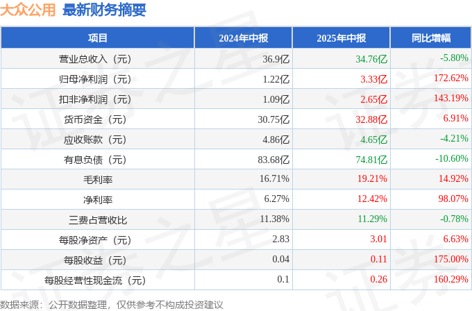 据证券之星公开数据整理,近期大众公用(600635)发布2025年中报。截至本报告期末,公司营业总收入34.76亿元,同比下降5.8%,归母净利润3.33亿元,同比上升172.62%。按单季度数据看,第二季度营业总收入13.77亿元,同比下降8.15%,第二季度归母净利润1.39亿元,同比上升47.02%。本报告期大众公用短期债务压力上升,流动比率达0.68。