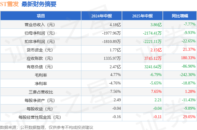 据证券之星公开数据整理,近期ST雪发(002485)发布2025年中报。根据财报显示,ST雪发净利润同比下降9.93%。截至本报告期末,公司营业总收入3.86亿元,同比下降7.77%,归母净利润-2174.41万元,同比下降9.93%。按单季度数据看,第二季度营业总收入1.68亿元,同比下降32.9%,第二季度归母净利润-1314.16万元,同比上升1.34%。