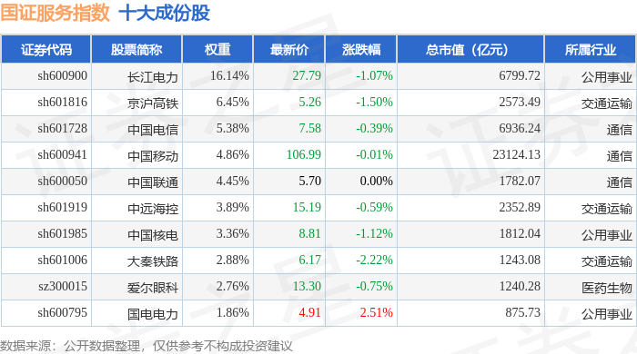证券之星消息,9月1日,国证服务(399320)指数报收于2176.59点,跌0.34%,成交498.57亿元,换手率0.91%。当日该指数成份股中,上涨的有40家,上海电力以9.99%的涨幅领涨,下跌的有53家,大秦铁路以2.22%的跌幅领跌。