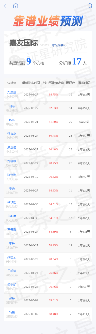 关于公司的相关逻辑和资料可以查阅分析师研报(计算过程主要参考分析师预测数据和公司历史财报数据)。此外该分析师对中国外运(601598)、东航物流(601156)、中谷物流(603565)等股票的研究也比较深入。嘉友国际的分析师靠谱业绩预测小工具截图如下: