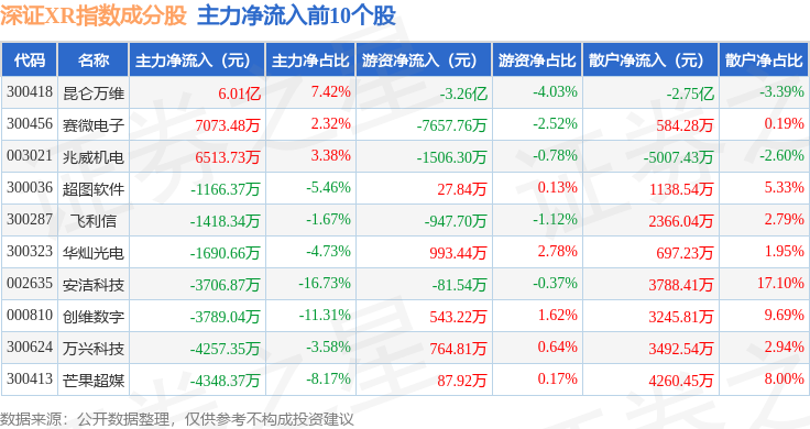 资金流向方面,深证XR(970046)指数成份股当日主力资金净流出合计92.25亿元,游资资金净流入合计11.32亿元,散户资金净流入合计80.93亿元。成份股资金流向详情见下表: