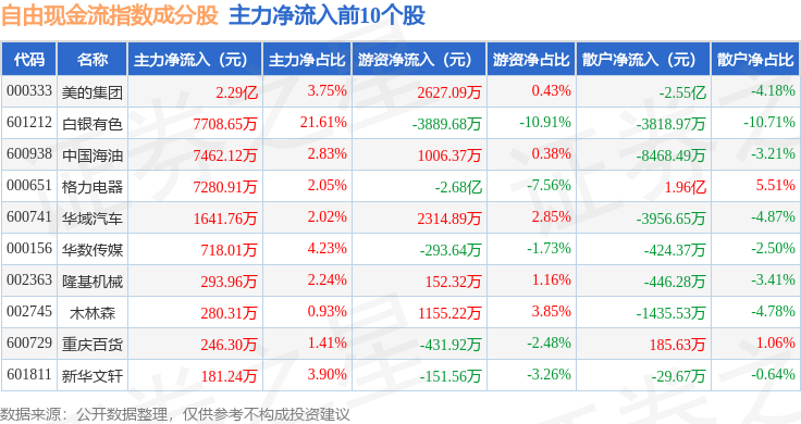 资金流向方面,自由现金流(980092)指数成份股当日主力资金净流出合计41.06亿元,游资资金净流入合计10.15亿元,散户资金净流入合计30.91亿元。成份股资金流向详情见下表:
