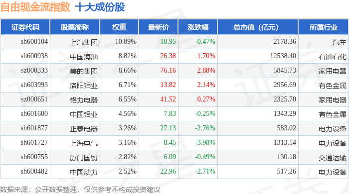自由现金流(980092)指数十大成份股详情如下: