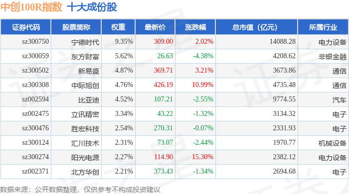 证券之星消息,9月3日,中创100R(399611)指数报收于2962.3点,涨0.18%,成交3218.03亿元,换手率2.32%。当日该指数成份股中,上涨的有32家,阳光电源以15.3%的涨幅领涨,下跌的有67家,中航成飞以14.34%的跌幅领跌。