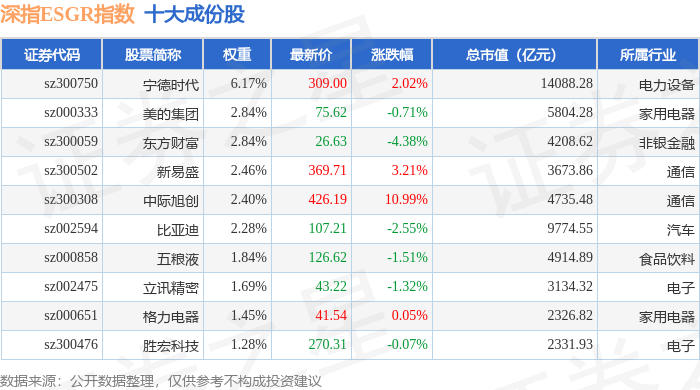 证券之星消息,9月3日,深指ESGR(470026)指数报收于17862.54点,跌0.53%,成交6007.38亿元,换手率2.19%。当日该指数成份股中,上涨的有84家,阳光电源以15.3%的涨幅领涨,下跌的有315家,中航成飞以14.34%的跌幅领跌。