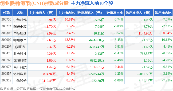 资金流向方面,创业板指(港币)(CNH)(970006)指数成份股当日主力资金净流出合计58.71亿元,游资资金净流出合计5.17亿元,散户资金净流入合计63.88亿元。成份股资金流向详情见下表: