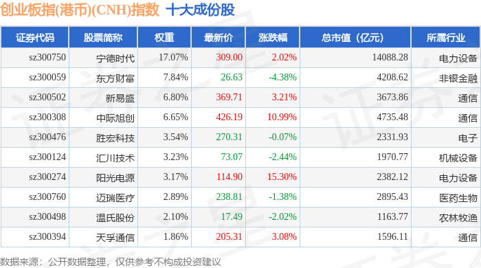 创业板指(港币)(CNH)(970006)指数十大成份股详情如下: