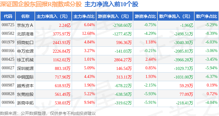 资金流向方面,深证国企股东回报R(470064)指数成份股当日主力资金净流出合计16.6亿元,游资资金净流入合计1.45亿元,散户资金净流入合计15.14亿元。成份股资金流向详情见下表: