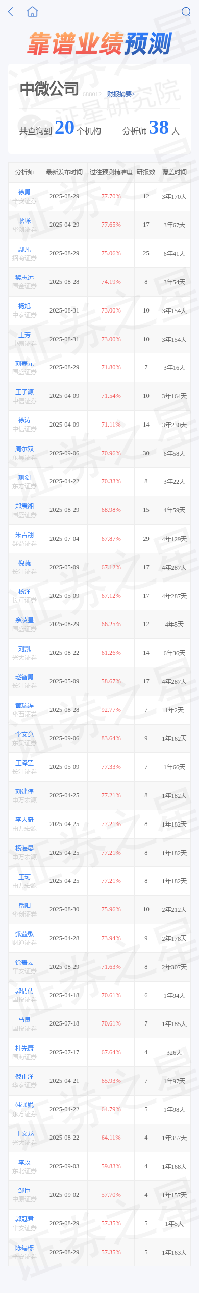 如果您对这家公司感兴趣,可以参考证星研究院统计的中微公司的分析师业绩预测数据,其中根据平安证券的分析师徐勇预测公司未来PE为35.0(更多特色估值数据尽在证星研究院,所有数据均来源公开资料,期且所有资料都存在一定时间滞后,所有相关数据均不可作为投资决策单一依据)。