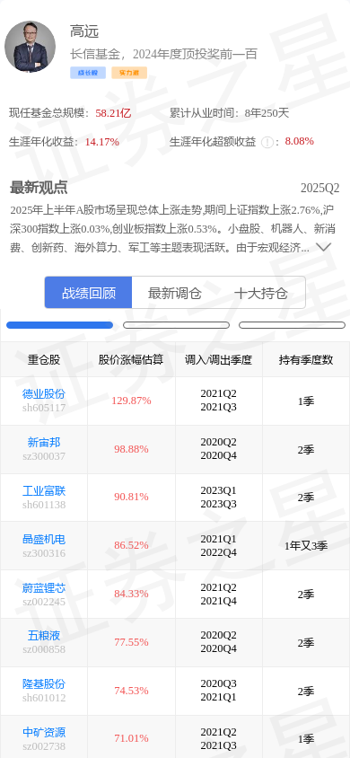 亿纬锂能(300014)是基金经理高远的重仓股。,其在整个职业生涯内年化收益高达14.17%。高远的大佬持仓 - 战绩回顾截图如下:
