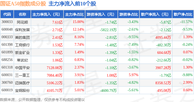 资金流向方面,国证A50(399310)指数成份股当日主力资金净流出合计102.62亿元,游资资金净流入合计25.47亿元,散户资金净流入合计77.16亿元。成份股资金流向详情见下表: