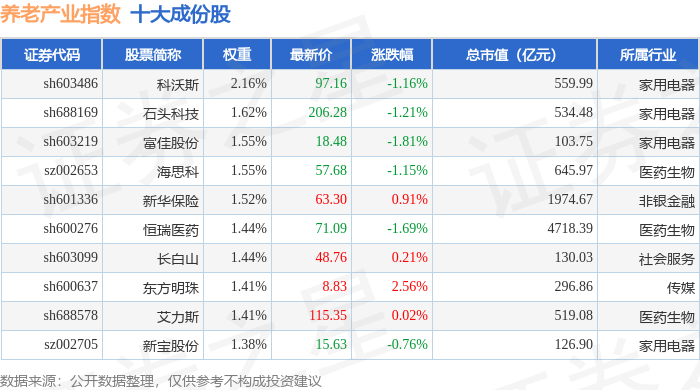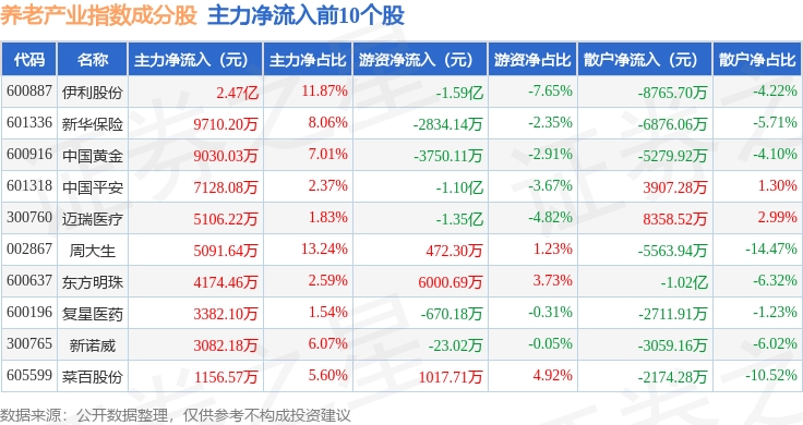 资金流向方面,养老产业(399812)指数成份股当日主力资金净流出合计12.23亿元,游资资金净流入合计1.43亿元,散户资金净流入合计10.81亿元。成份股资金流向详情见下表: