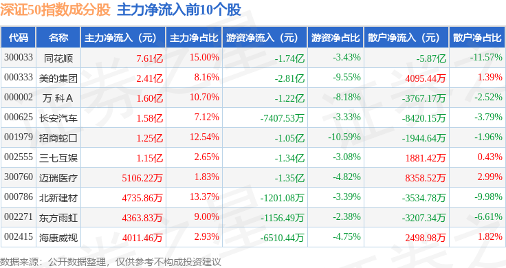 资金流向方面,深证50(399850)指数成份股当日主力资金净流出合计104.15亿元,游资资金净流入合计27.59亿元,散户资金净流入合计76.55亿元。成份股资金流向详情见下表: