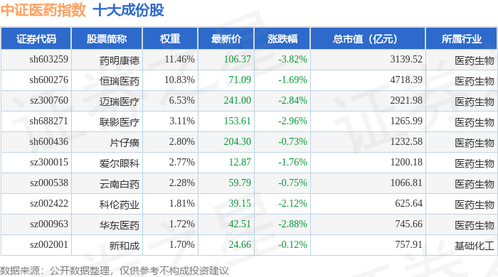 证券之星消息,9月9日,中证医药(399933)指数报收于9414.71点,跌1.88%,成交593.52亿元,换手率1.46%。当日该指数成份股中,上涨的有13家,以岭药业以2.58%的涨幅领涨,下跌的有66家,华海药业以10.0%的跌幅领跌。