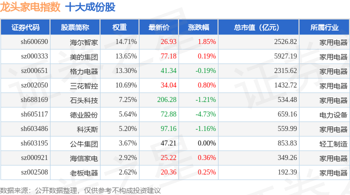 龙头家电(980028)指数十大成份股详情如下: