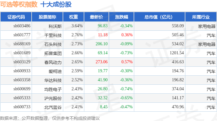 证券之星消息,9月10日,可选等权(000073)指数报收于3488.96点,跌0.79%,成交369.36亿元,换手率1.41%。当日该指数成份股中,上涨的有12家,际华集团以2.65%的涨幅领涨,下跌的有37家,新泉股份以6.4%的跌幅领跌。