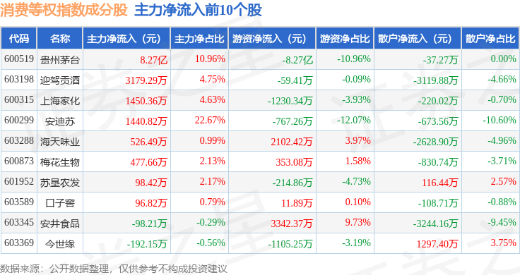 资金流向方面,消费等权(000074)指数成份股当日主力资金净流入合计5.15亿元,游资资金净流出合计5.5亿元,散户资金净流入合计3514.66万元。成份股资金流向详情见下表: