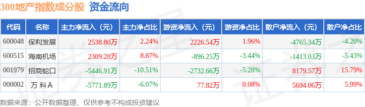 资金流向方面,300地产(000952)指数成份股当日主力资金净流出合计6370.72万元,游资资金净流出合计1324.55万元,散户资金净流入合计7695.26万元。成份股资金流向详情见下表: