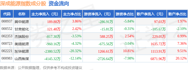 资金流向方面,深成能源(399680)指数成份股当日主力资金净流出合计7991.95万元,游资资金净流出合计1850.05万元,散户资金净流入合计9842.0万元。成份股资金流向详情见下表: