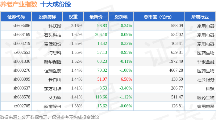 资金流向方面,养老产业(399812)指数成份股当日主力资金净流出合计13.59亿元,游资资金净流入合计5.66亿元,散户资金净流入合计7.94亿元。成份股资金流向详情见下表: