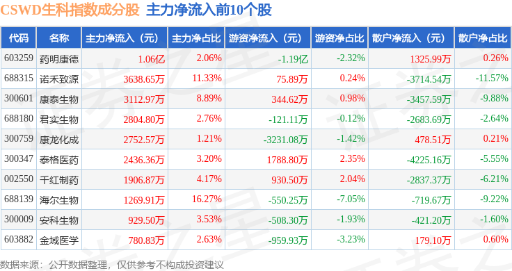 资金流向方面,CSWD生科(399993)指数成份股当日主力资金净流出合计12.1亿元,游资资金净流入合计5.16亿元,散户资金净流入合计6.94亿元。成份股资金流向详情见下表: