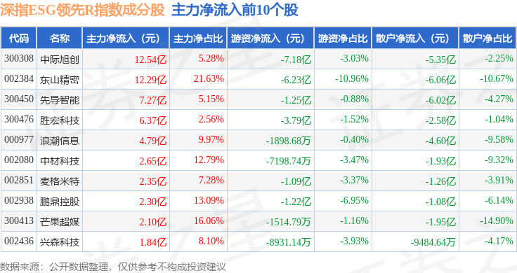 资金流向方面,深指ESG领先R(470029)指数成份股当日主力资金净流出合计23.0亿元,游资资金净流出合计11.03亿元,散户资金净流入合计34.03亿元。成份股资金流向详情见下表: