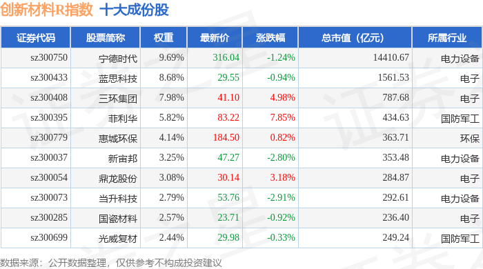 证券之星消息,9月10日,创新材料R(470039)指数报收于5165.31点,涨0.39%,成交544.12亿元,换手率4.2%。当日该指数成份股中,上涨的有16家,立中集团以10.8%的涨幅领涨,下跌的有33家,中伟股份以5.26%的跌幅领跌。