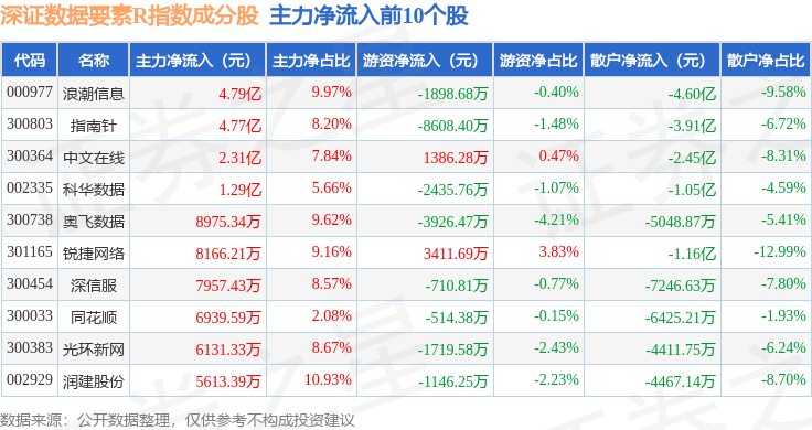 资金流向方面,深证数据要素R(470053)指数成份股当日主力资金净流入合计11.44亿元,游资资金净流入合计4056.9万元,散户资金净流出合计11.85亿元。成份股资金流向详情见下表: