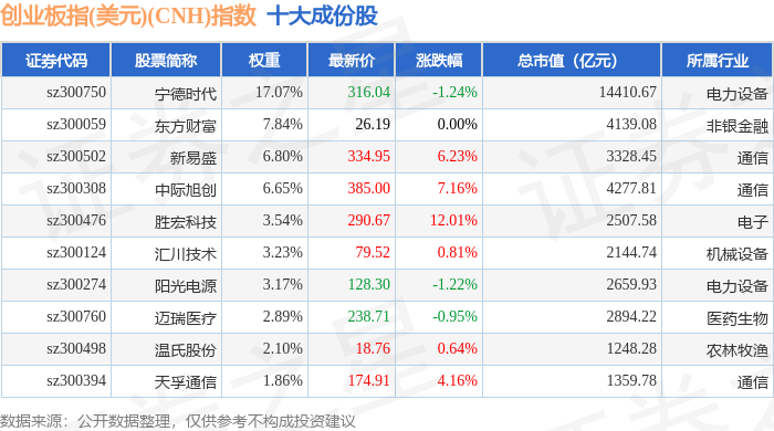 创业板指(美元)(CNH)(970007)指数十大成份股详情如下: