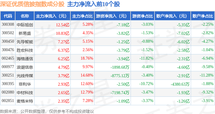 资金流向方面,深证优质信披(970065)指数成份股当日主力资金净流出合计28.49亿元,游资资金净流出合计10.22亿元,散户资金净流入合计38.71亿元。成份股资金流向详情见下表:
