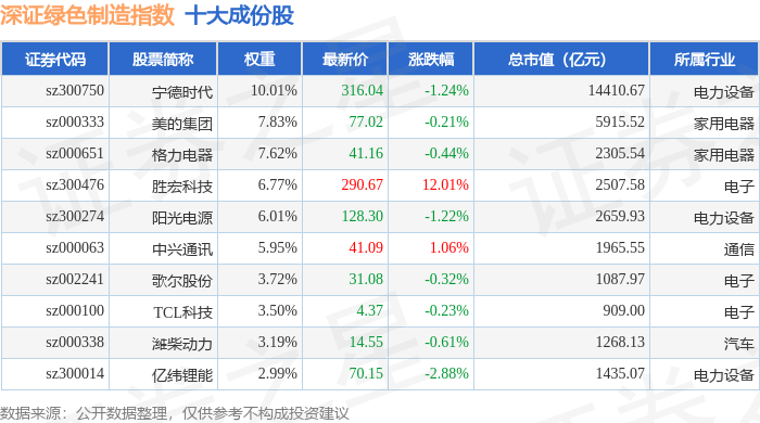 证券之星消息,9月10日,深证绿色制造(970069)指数报收于1733.72点,涨0.07%,成交1274.09亿元,换手率2.26%。当日该指数成份股中,上涨的有9家,胜宏科技以12.01%的涨幅领涨,下跌的有40家,中伟股份以5.26%的跌幅领跌。