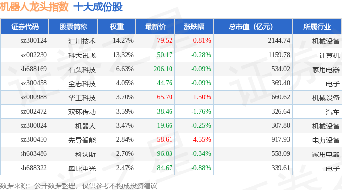 证券之星消息,9月10日,机器人龙头(980071)指数报收于2543.9点,涨0.27%,成交551.64亿元,换手率3.37%。当日该指数成份股中,上涨的有19家,伟创电气以8.01%的涨幅领涨,下跌的有30家,罗博特科以3.19%的跌幅领跌。