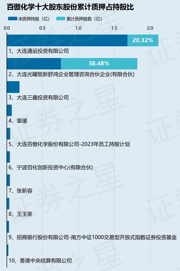 截止本公告日,股东大连通运投资有限公司已累计质押股份4300.0万股,占其持股总数的20.32%,股东大连光曜致新舒鸿企业管理咨询合伙企业(有限合伙)已累计质押股份1.07亿股,占其持股总数的58.48%。本次质押后百傲化学十大股东的累计质押股份占持股比例(占持股比例的计算以公司最新一期财务报表公布的十大股东的持股总数为基准)见下图: