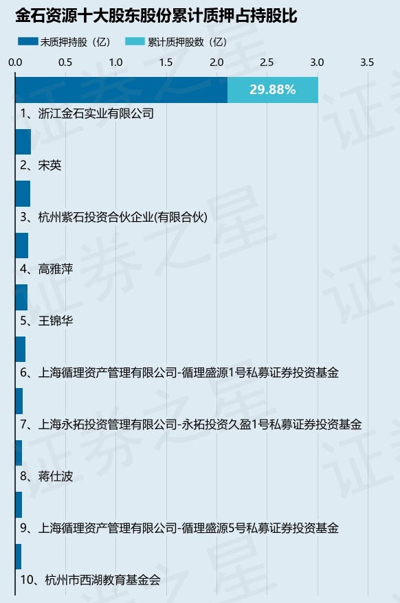 截止本公告日,股东浙江金石实业有限公司已累计质押股份8984.0万股,占其持股总数的29.88%。本次质押后金石资源十大股东的累计质押股份占持股比例(占持股比例的计算以公司最新一期财务报表公布的十大股东的持股总数为基准)见下图: