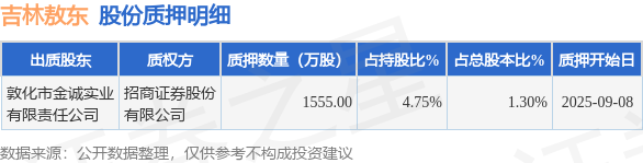 证券之星消息,吉林敖东(000623)9月10日公开信息显示,股东敦化市金诚实业有限责任公司向招商证券股份有限公司合计质押1555.0万股,占总股本1.3%。质押详情见下表: