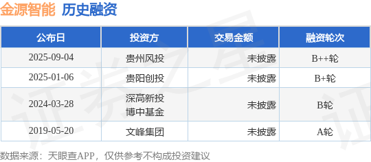 证券之星消息,根据天眼查APP于9月4日公布的信息整理,南通金源智能技术有限公司B++轮融资,融资额未披露,参与投资的机构包括贵州风投。