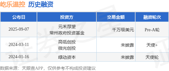 证券之星消息,根据天眼查APP于9月7日公布的信息整理,屹乐温控科技(常州)有限公司Pre-A轮融资,融资额千万级美元,参与投资的机构包括元禾厚望,常州政府投资基金。