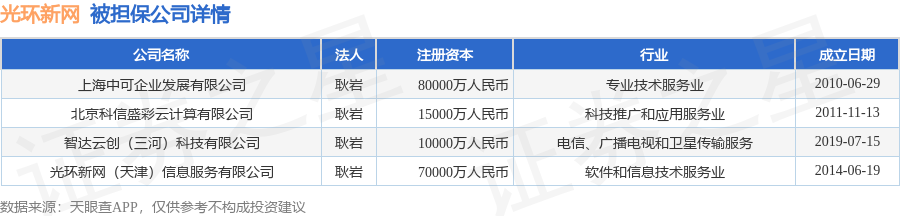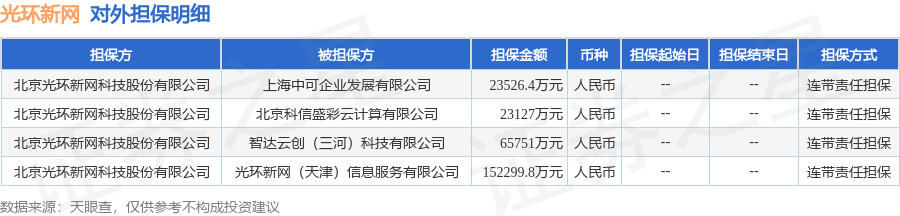 光环新网8月26日披露4笔对外担保,被担保公司4家。对外担保明细如下表: