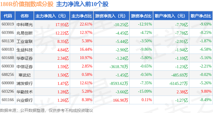资金流向方面,180R价值(000031)指数成份股当日主力资金净流入合计30.24亿元,游资资金净流出合计33.09亿元,散户资金净流入合计2.85亿元。成份股资金流向详情见下表: