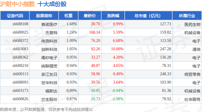 证券之星消息,9月11日,沪财中小(000091)指数报收于14342.22点,涨1.65%,成交524.77亿元,换手率2.71%。当日该指数成份股中,上涨的有146家,迈信林以12.4%的涨幅领涨,下跌的有48家,科森科技以4.23%的跌幅领跌。