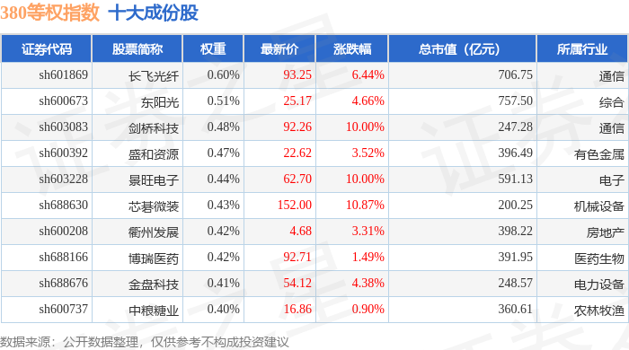 380等权(000115)指数十大成份股详情如下: