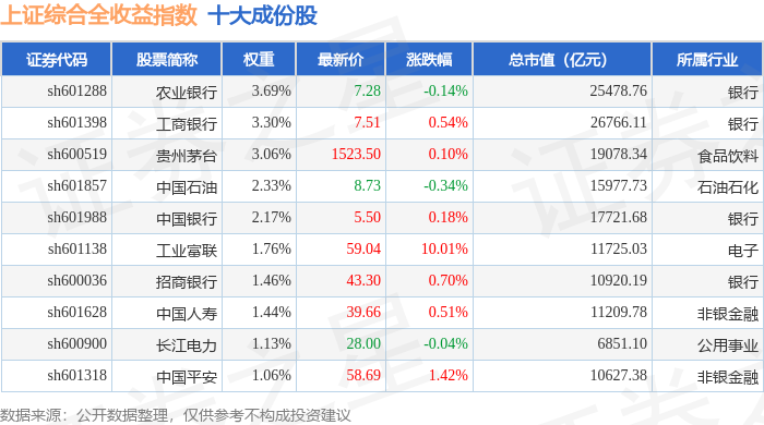 上证综合全收益(000888)指数十大成份股详情如下:
