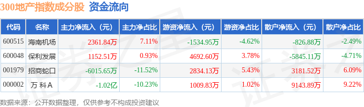 资金流向方面,300地产(000952)指数成份股当日主力资金净流出合计1.27亿元,游资资金净流入合计7001.61万元,散户资金净流入合计5653.41万元。成份股资金流向详情见下表:
