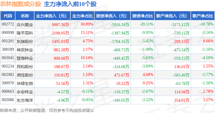 资金流向方面,农林指数(399231)成份股当日主力资金净流出合计5.59亿元,游资资金净流入合计4308.67万元,散户资金净流入合计5.15亿元。成份股资金流向详情见下表: