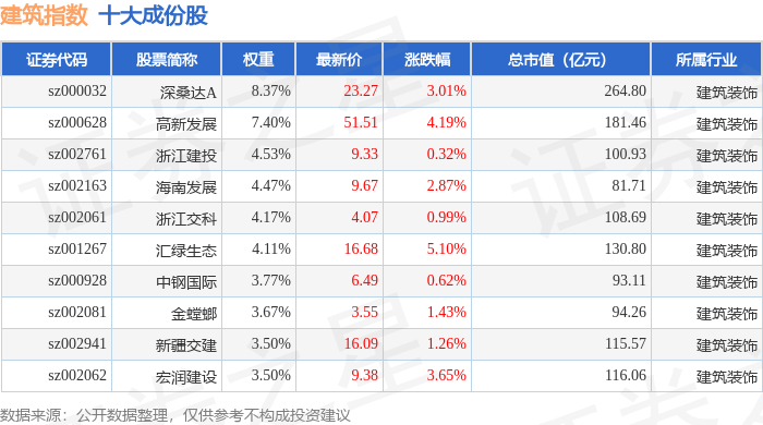 建筑指数(399235)十大成份股详情如下: